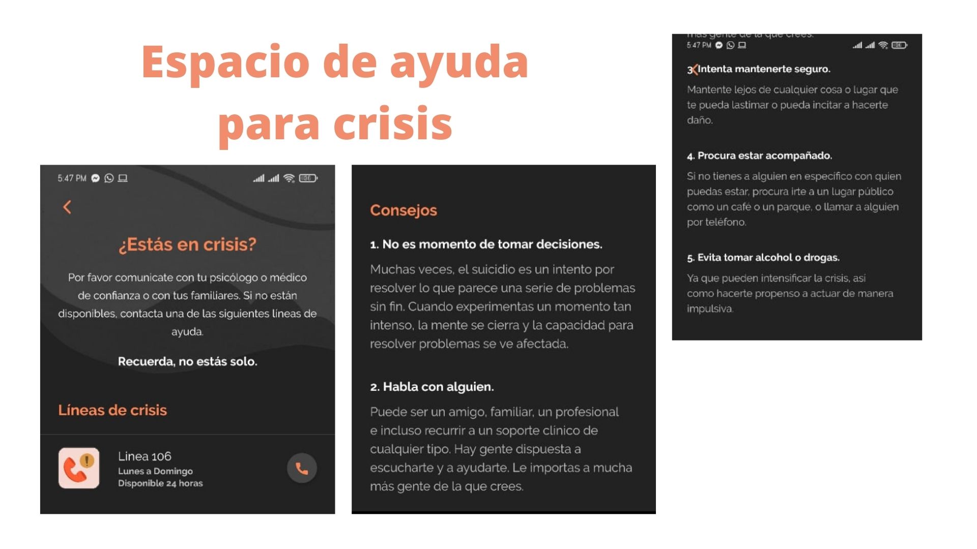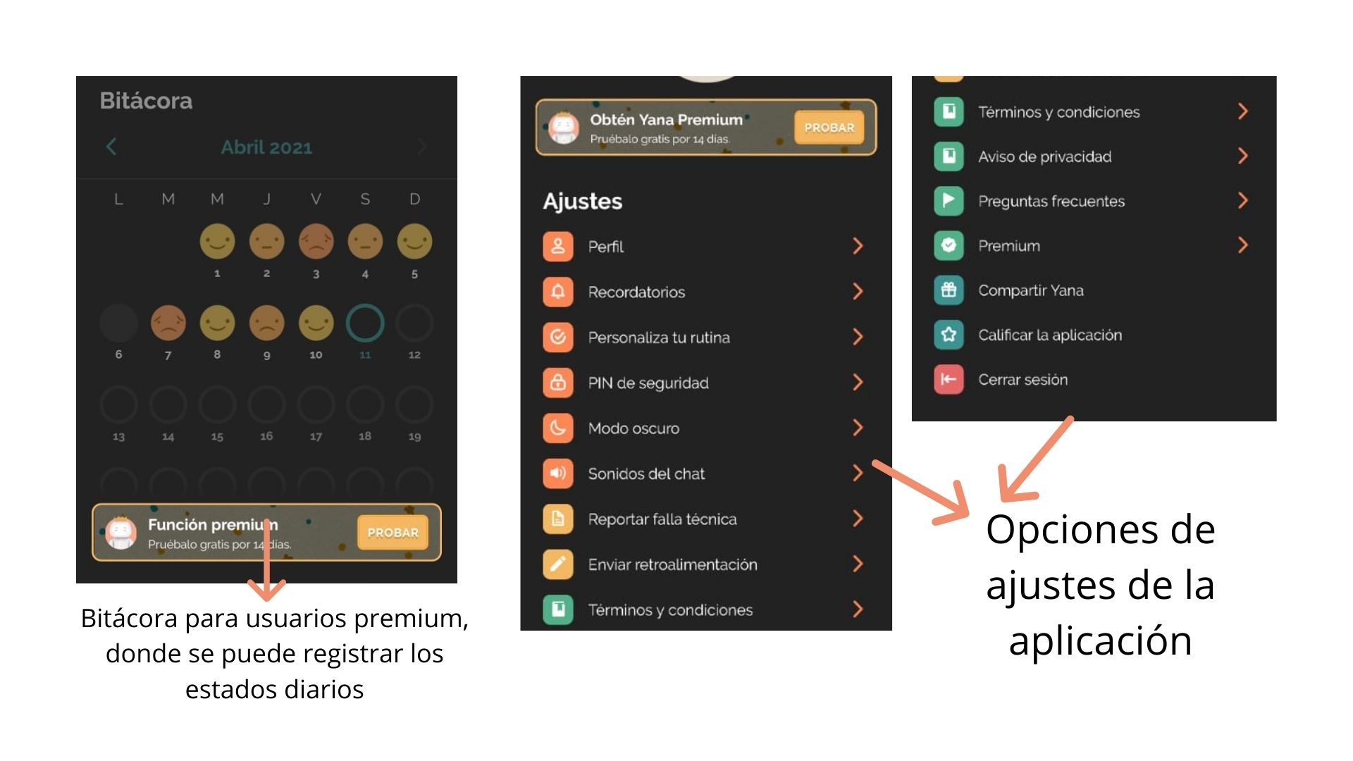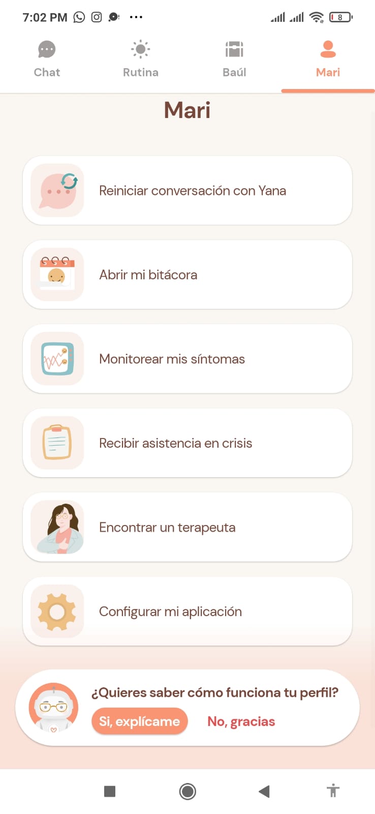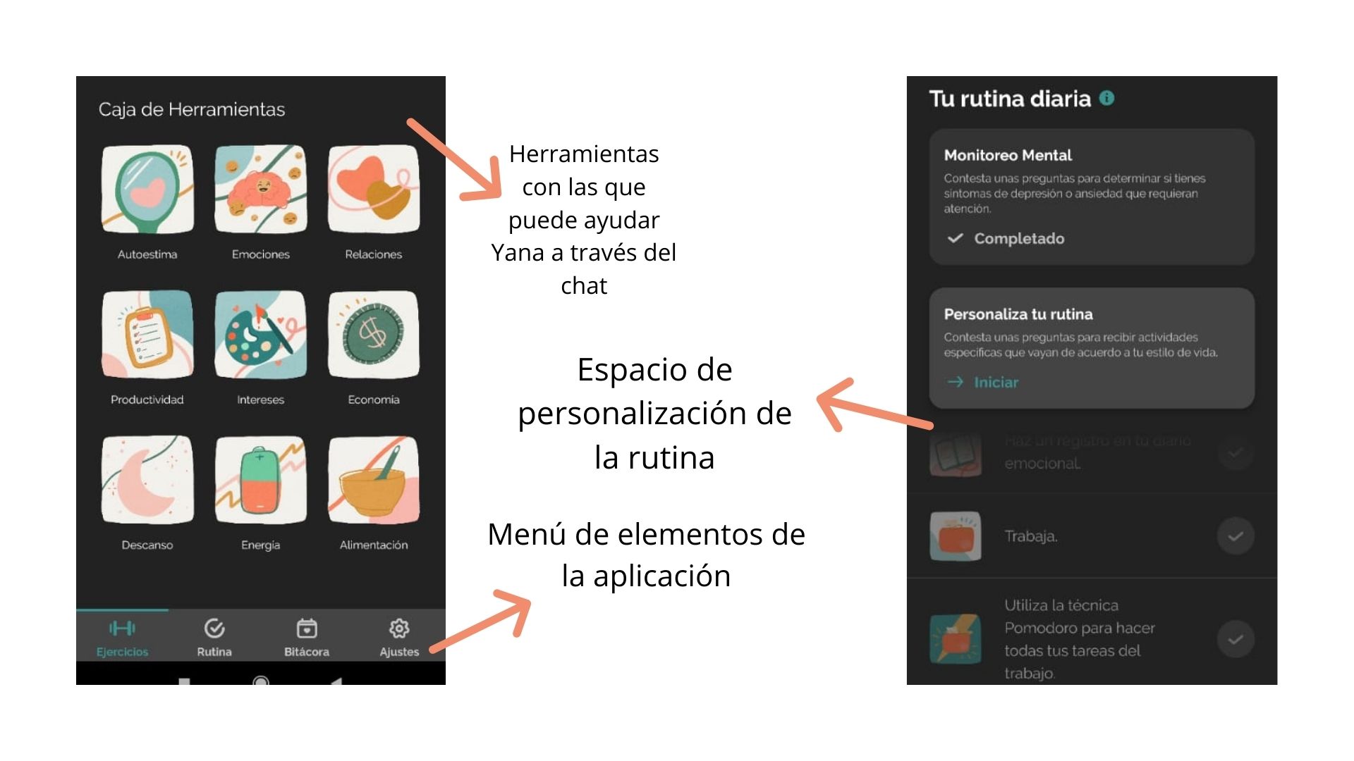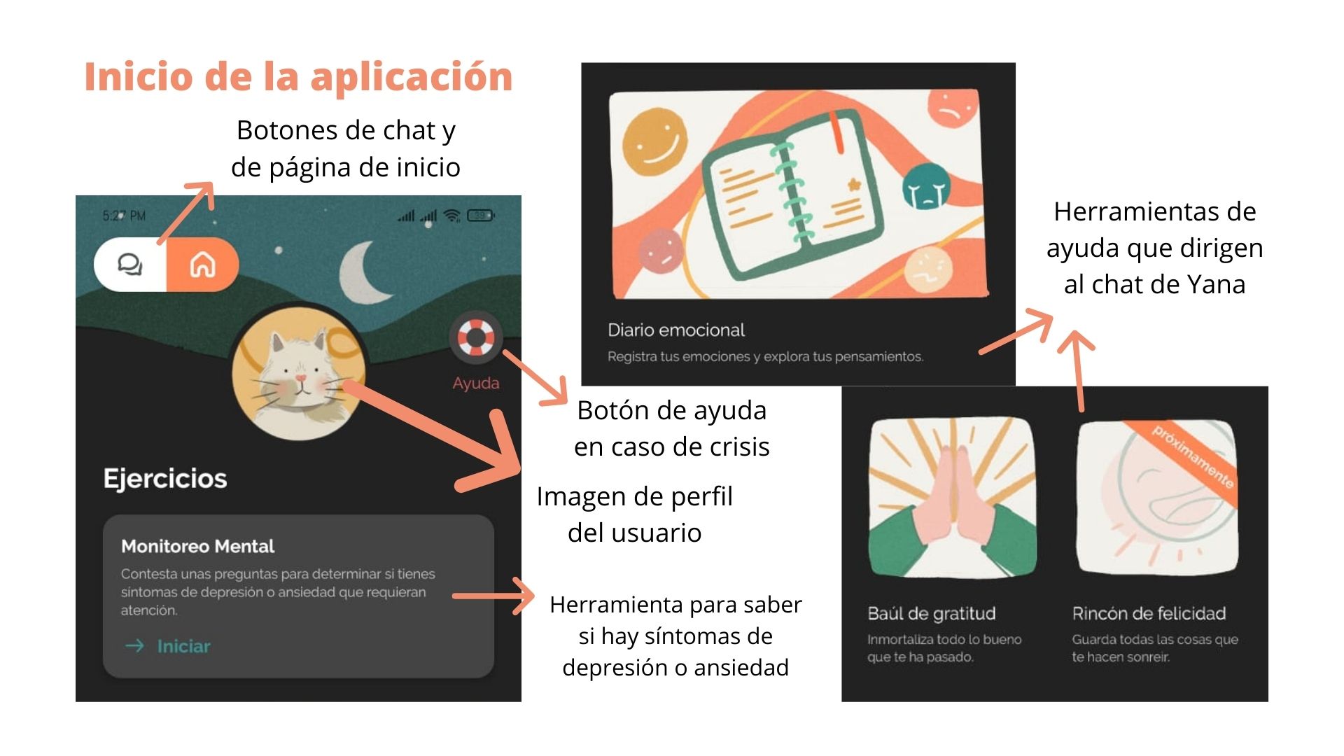 Yana es una aplicación basada en inteligencia artificial que, por medio de un chat con un personaje caracterizado como un robot, busca dar consejos y herramientas para ayudar a la persona con su situación emocional o mental; esto se lleva a cabo por medio de preguntas específicas con opciones variadas de respuesta, todas guiadas al tema o aspecto de la vida por el cual se busca apoyo. La aplicación también tiene algunos elementos extra como lo es el “monitoreo mental”, que por medios de preguntas determina si la persona tiene síntomas de depresión o ansiedad; un “diario emocional”, para que el usuario anote cómo se siente diariamente; un “baúl de gratitud” para que la persona anote todas las cosas por las que agradece; y una opción de “rutina” para poner allí lo que se hace en el día a día.